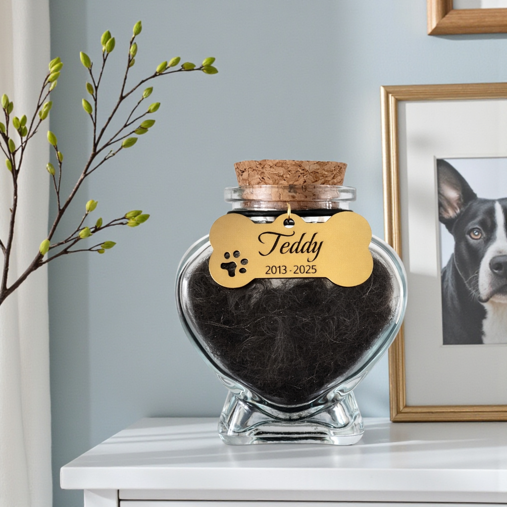 Eine Erinnerungsflasche ist ein kleines, dezentes und persönliches Andenken, in dem Sie etwas Wertvolles aufbewahren können. Viele Menschen bewahren darin eine Locke des Fells ihres Hundes oder ihrer Katze auf. Es ist eine sanfte, greifbare Erinnerung, die Ihnen hilft, Ihrem geliebten Tier auf friedvolle und tröstliche Weise nahe zu sein.