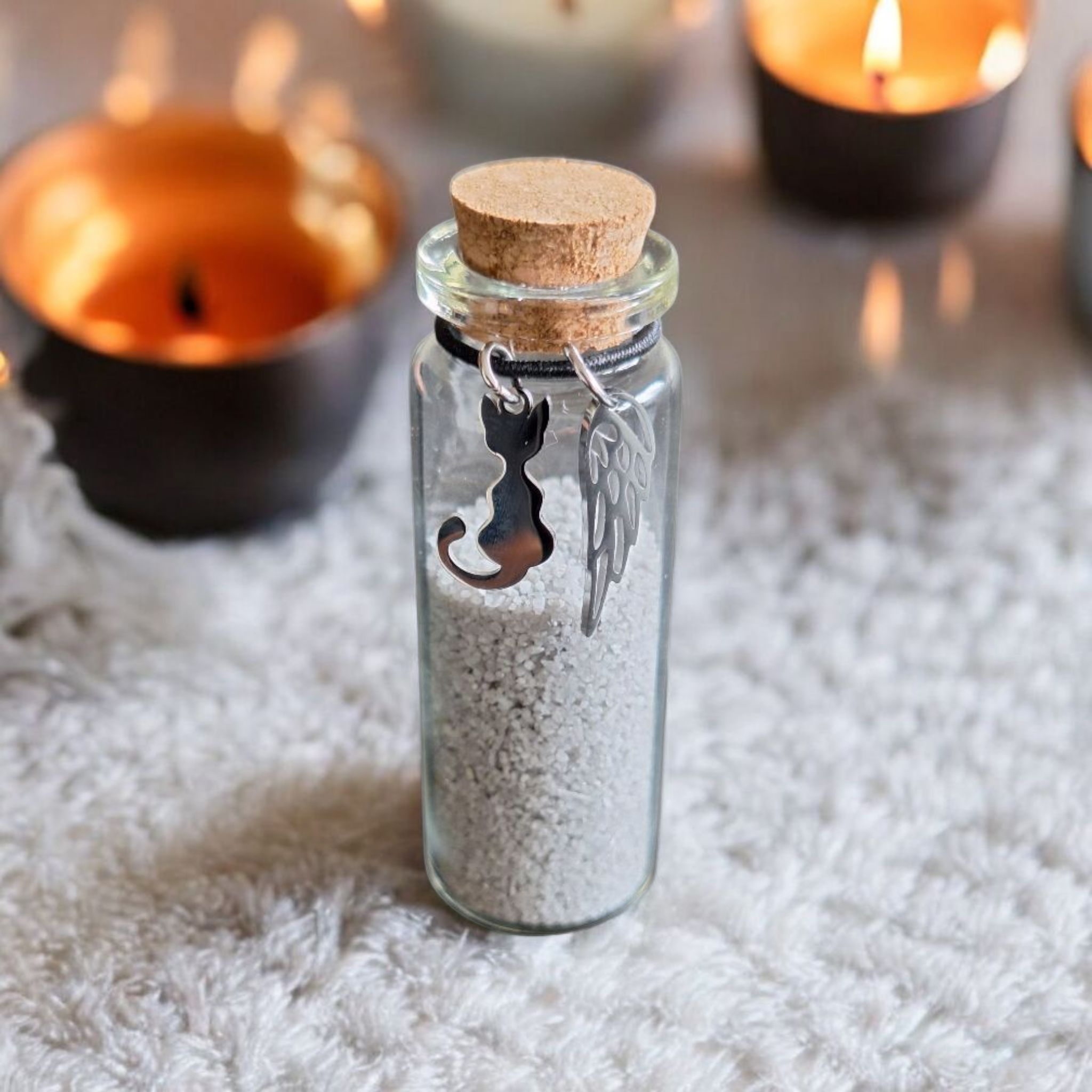 Memorial flesjes voor kat zijn een klein, persoonlijk aandenken aan je kat. Je kunt er een plukje haar van je kat in bewaren, maar ook snorhaartjes, tandjes of een kleine hoeveelheid as. Veel mensen gebruiken een memorial flesje als aanvulling op een urn of als onderdeel van een rustig gedenkhoekje met bijvoorbeeld een foto en een kaarsje.