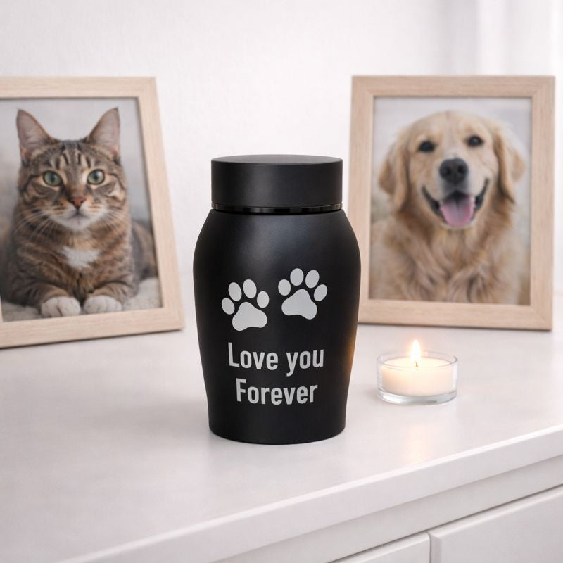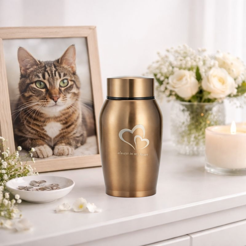 Eine Urne aus Edelstahl bietet eine friedliche und respektvolle Möglichkeit, Abschied zu nehmen und der Erinnerung an Ihr Haustier einen bleibenden Platz zu geben.