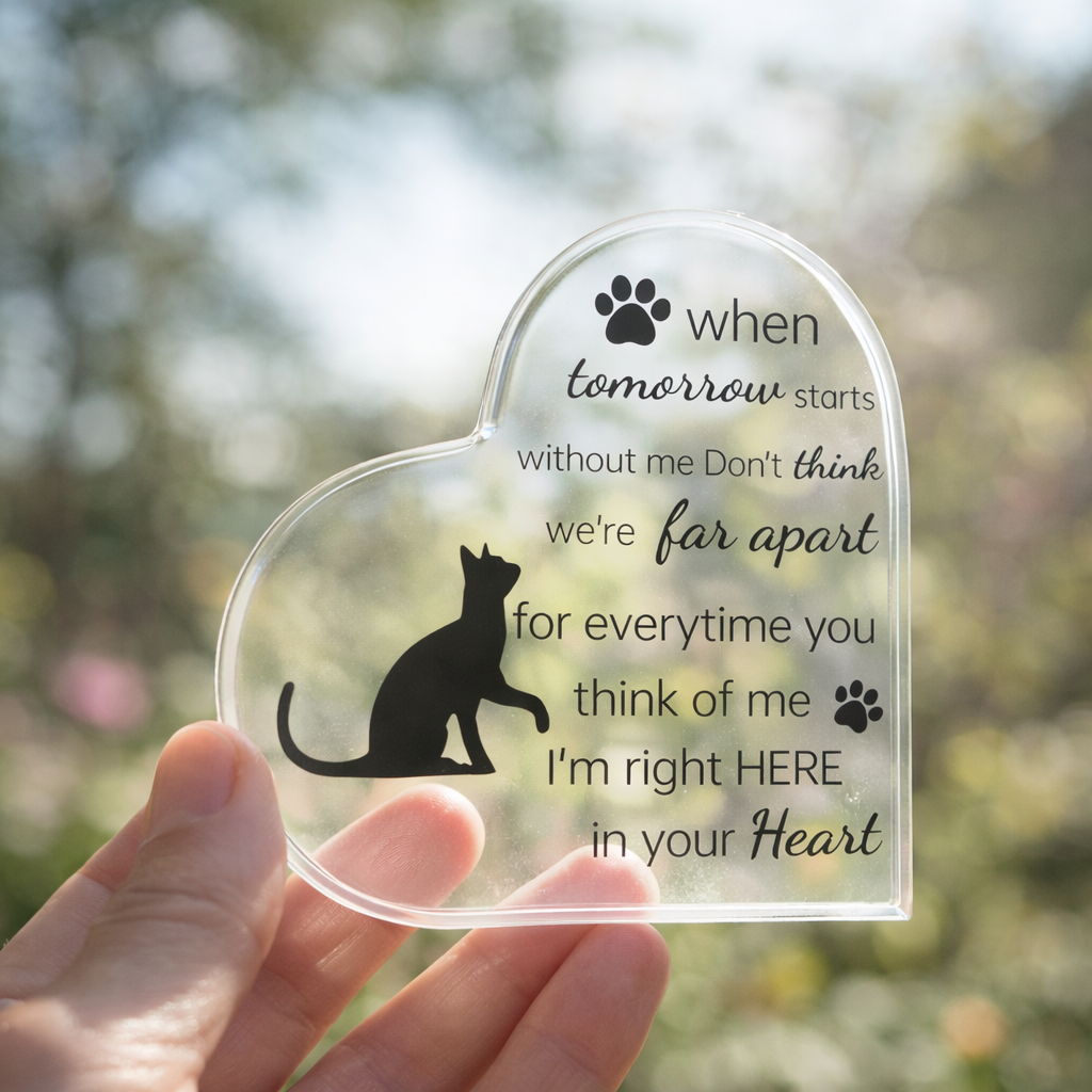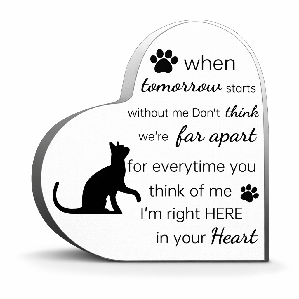 Dieses Acryl-Gedenkherz mit der tröstlichen Botschaft: „Wenn der morgige Tag ohne mich beginnt, denke nicht, dass wir weit voneinander entfernt sind. Du wirst immer an mich denken, ich bin in deinem Herzen“, eignet sich perfekt, um es neben Fotos, einer Urne oder in einer Gedenkecke Ihres Zuhauses aufzustellen. Diese Gedenkfigur ist ein wunderschönes Geschenk für Sie selbst oder für jemanden, der sich von einer geliebten Katze verabschieden musste.