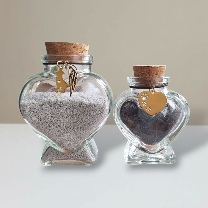 Mit diesen Gedenkflaschen bewahren Sie eine greifbare Erinnerung an Ihren geliebten Hund auf liebevolle Weise auf. Eine Flasche enthält eine Haarlocke, die andere eine kleine Menge Asche.