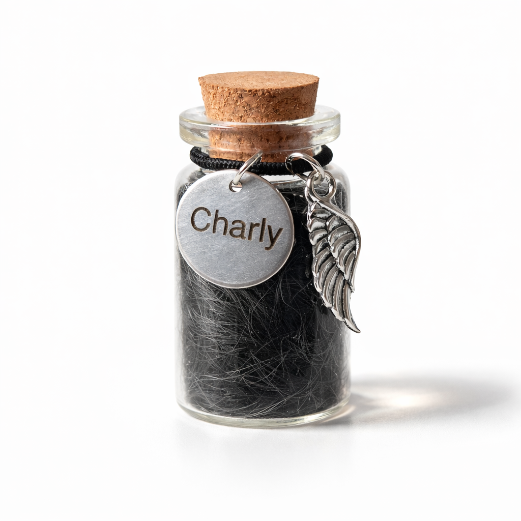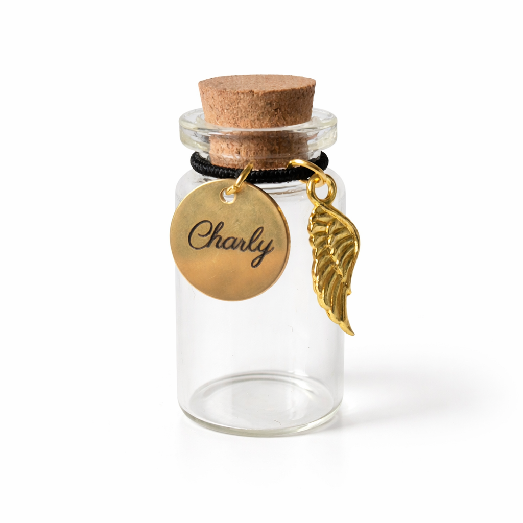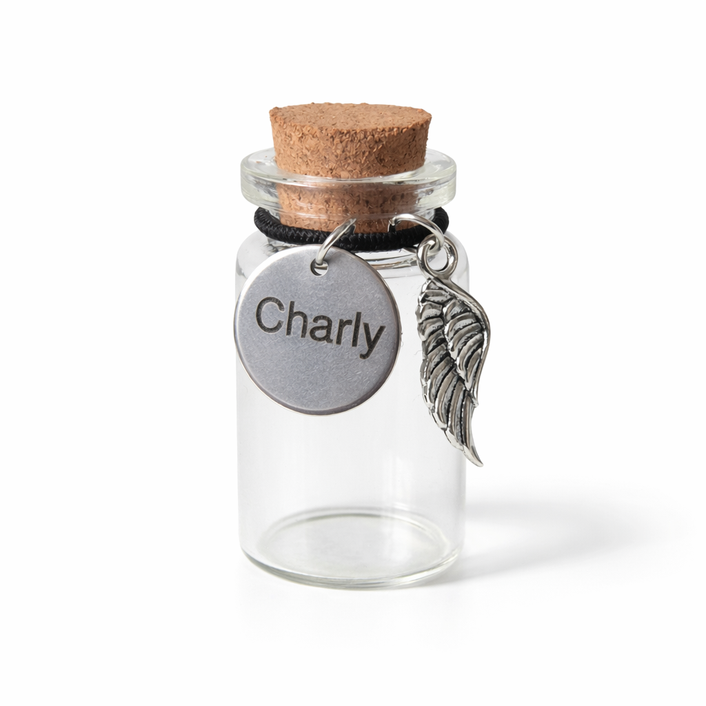 Je kunt kiezen uit twee kleuren voor de hanger, twee lettertypes en twee formaten voor het flesje.