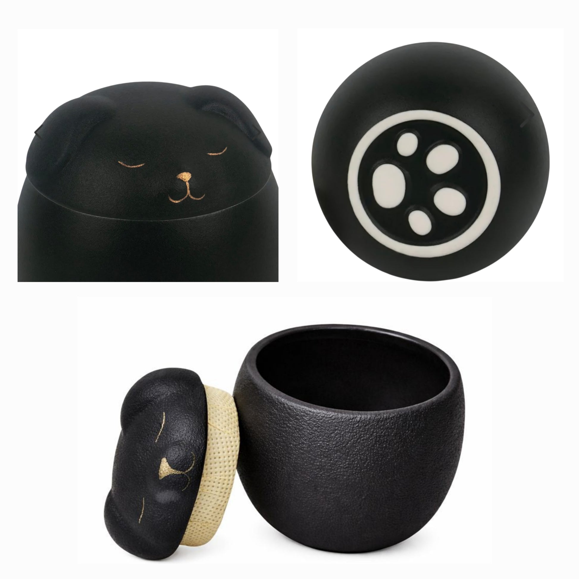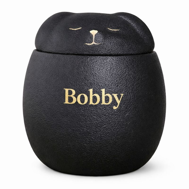 Diese schwarze Mini-Urne ist als liebevolle und tröstliche Erinnerung an einen treuen Freund gestaltet. Sie hat die Form eines schlafenden Welpen mit geschlossenen Augen und dezenten goldenen Details. Gefertigt aus Keramik mit einer matten, weichen Oberfläche, eignet sie sich dank ihrer kompakten Größe ideal für eine kleine Menge Asche.