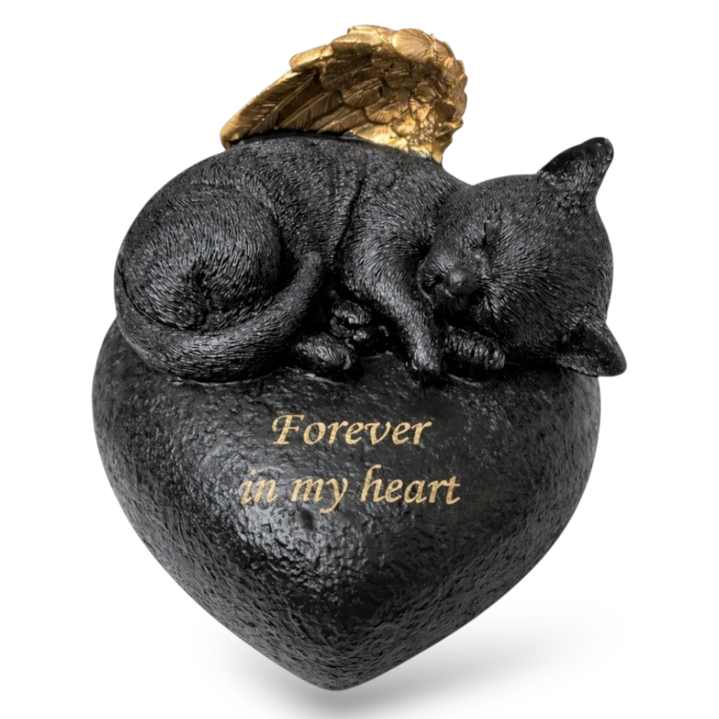 Eine liebevolle Erinnerung an Ihre geliebte Katze, verewigt in einer stilvollen Urne. Diese herzförmige Gedenkurne zeigt ein friedlich schlafendes Kätzchen mit goldenen Engelsflügeln – ein Symbol ewigen Friedens und Verbundenheit. Diese Urne ist ein wunderschönes Andenken für Ihr Zuhause. Eine tröstliche Art, Ihr geliebtes Haustier in Ihrer Nähe zu wissen.