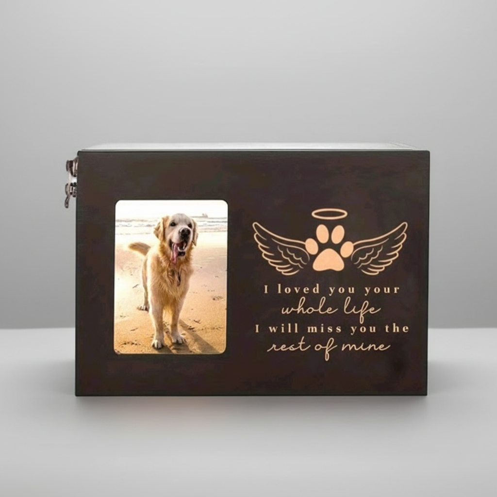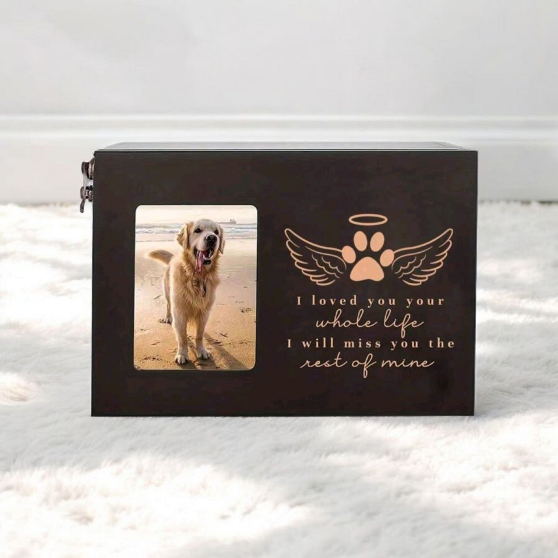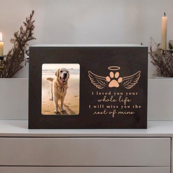 Mit ihrem sicheren Design bietet diese Urne einen würdevollen Ort für die Asche Ihres geliebten Begleiters. Dank ihrer Größe eignet sie sich für mittelgroße bis große Hunde, Katzen und andere Haustiere. Die Urne enthält einen Bilderrahmen (5 x 7,5 cm), in den Sie ein Foto Ihres geliebten Freundes stellen können. Auf der rechten Seite befindet sich eine rührende Botschaft in goldener Schrift: „Ich habe dich dein ganzes Leben lang geliebt, ich werde dich mein ganzes Leben lang vermissen.“ Eine stilvolle und emotionale Art, sich an Ihr Haustier zu erinnern.