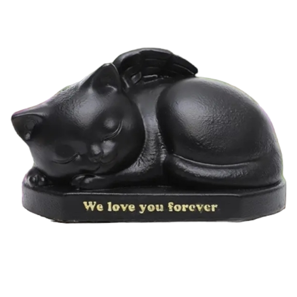 Eine wunderschöne Urne zum Gedenken an Ihre geliebte Katze. Die Urne in Form eines schlafenden Kätzchens mit Engelsflügeln ist eine berührende und liebevolle Hommage. Die Aufschrift „Wir lieben dich für immer“ macht sie zu einem besonderen und bleibenden Andenken.